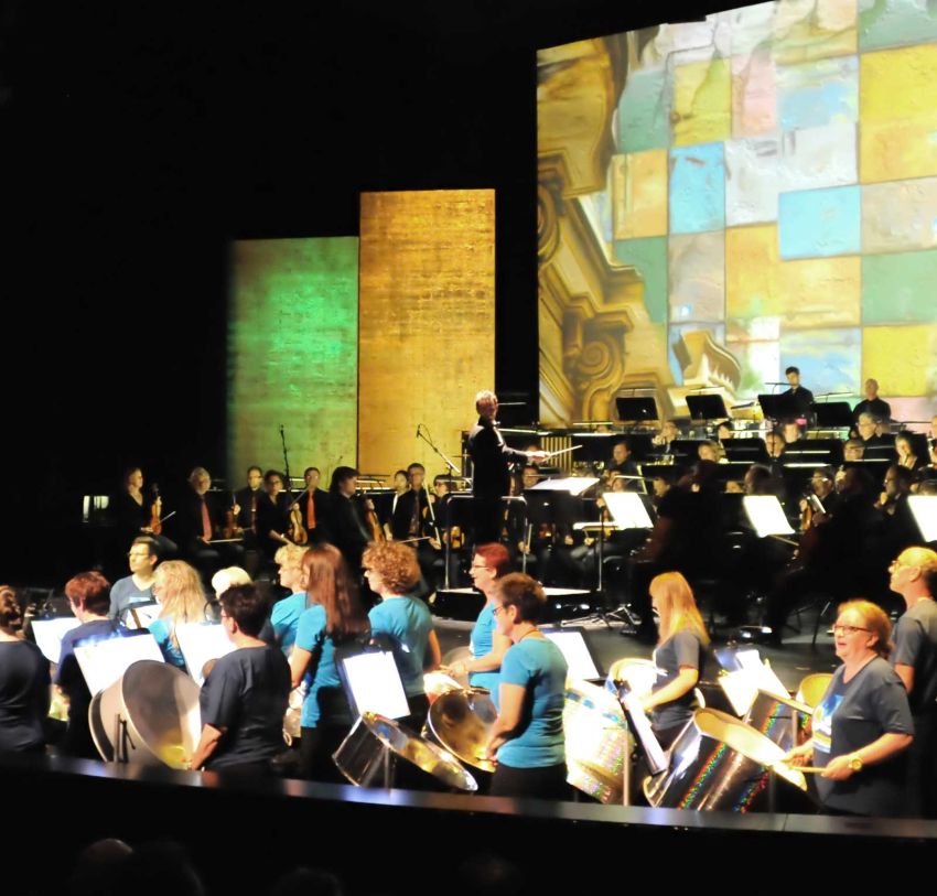 • Das Erlebnis des vollen, satten Klangs eines klassisch besetzten Steeldrum-Orchesters. Es klingt aufgrund seines enormen Tonumfangs und seiner vielfältigen Klangschattierungen einfach unvergleichlich und ist auch optisch beeindruckend. Gespielt wird mit Sechser- und Vierer-Bass (jeweils sechs, bzw. vier Ölfässer), Double- und Triple Bariton, Double Tenor, Double Alto, Big Mama und Soprano. BÄNG BÄNG, das Orchester, spielt je nach Anlass in einer Besetzung von 15 bis 30 Spieler/innen. Für Auftritte wird eine Bühne ab 40 Quadratmetern benötigt. Eine technische Verstärkung ist grundsätzlich nicht nötig, bei einer großen Zuschauermenge und unter offenem Himmel allerdings sinnvoll.